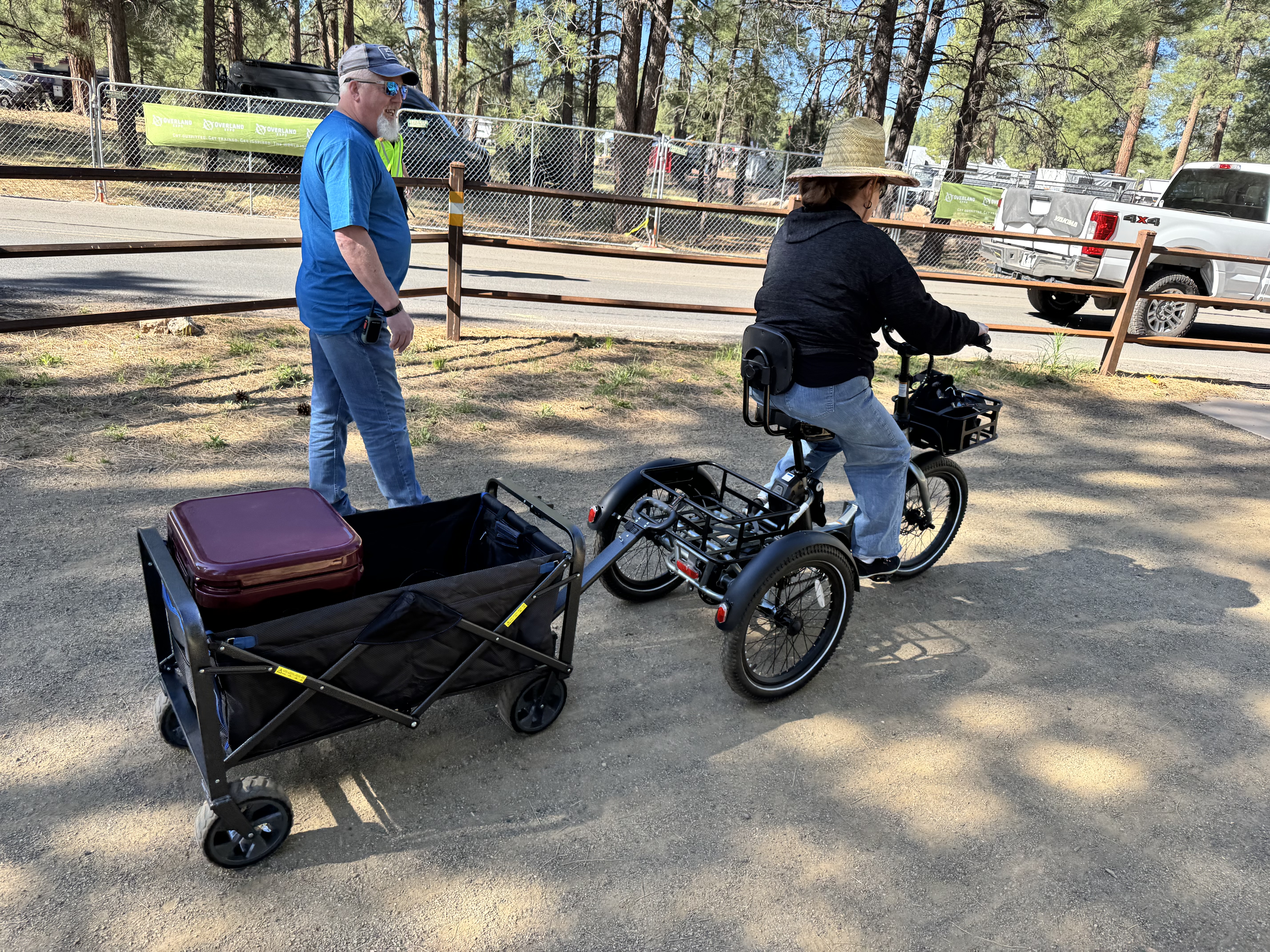 Our Overland Expo setup – Kelly’s trike and the Costco wagon in action